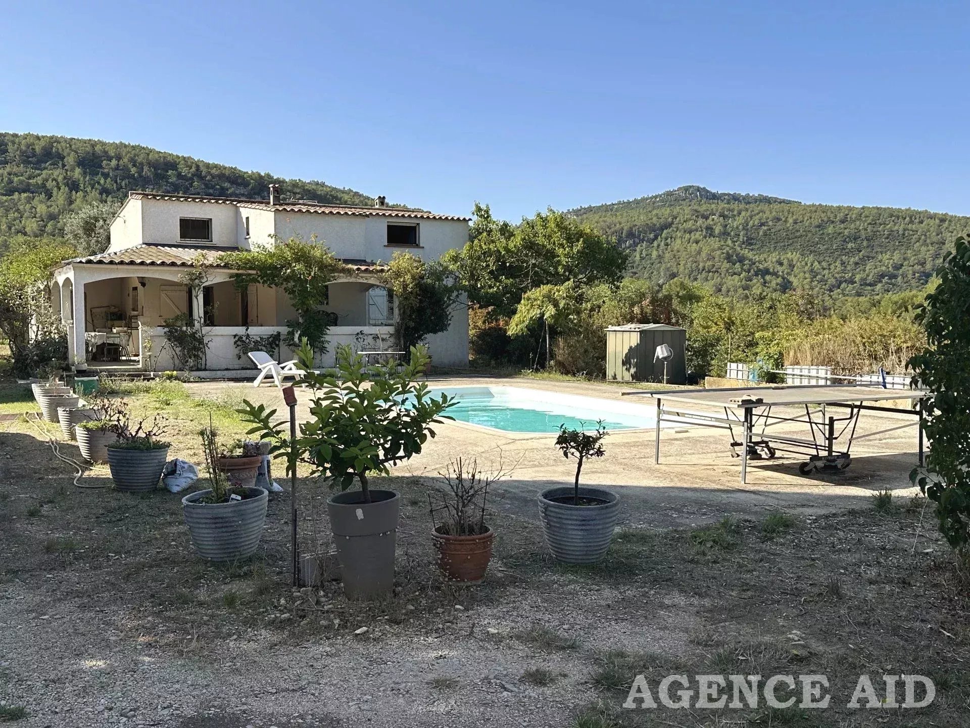Villa T5 Cuges les Pins dans cadre champêtre proximité des commodités beau terrain d'une superficie d'environ 2567m2 plat clos arboré piscine plage dallée vue imprenable dégagée sur les collines et le village Villa T5 de caractère provençal T5 137m2 hab environ construction traditionnelle sur 2 niveaux elle se compose Au rdc :d'un hall d'entrée d'un séjour/salon cheminée avec insert d'une grande cuisine équipée donnant sur terrasse , d'un dégagement ,d'une chambre équipée de placards penderies salle de bains wc séparé A l'étage : 3 chambres équipées de placards de rangements salle d'eau e wc séparé parquet au sol beau potentiel à moderniser