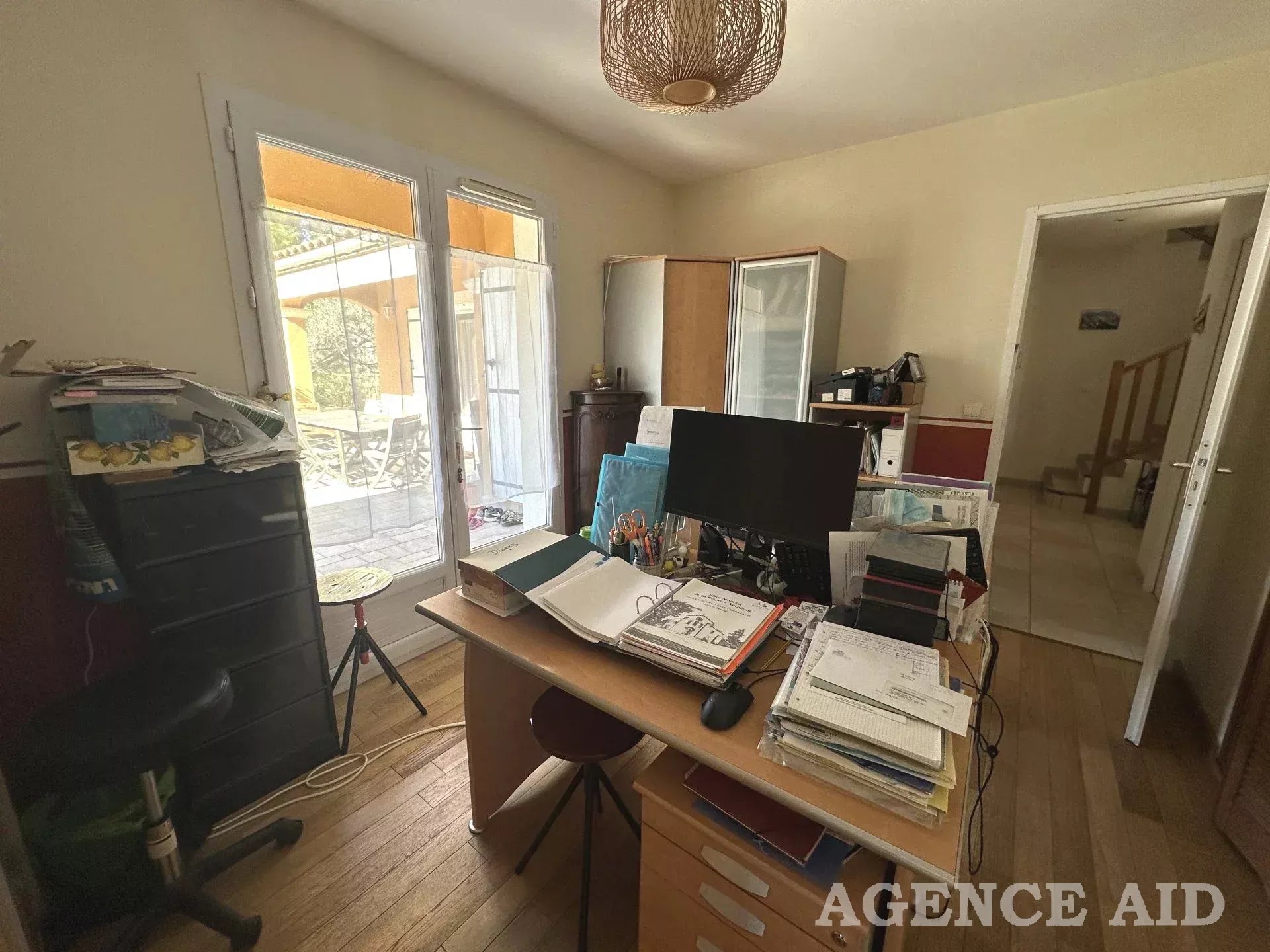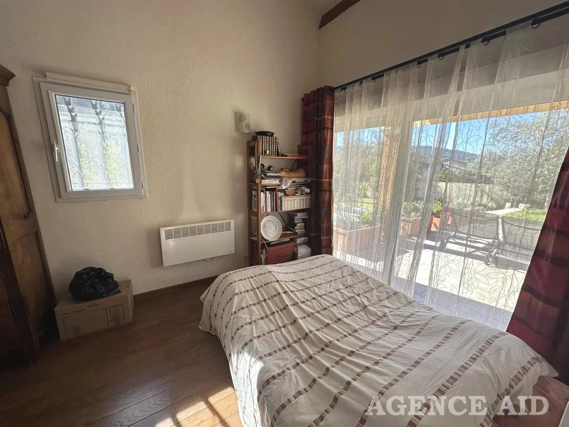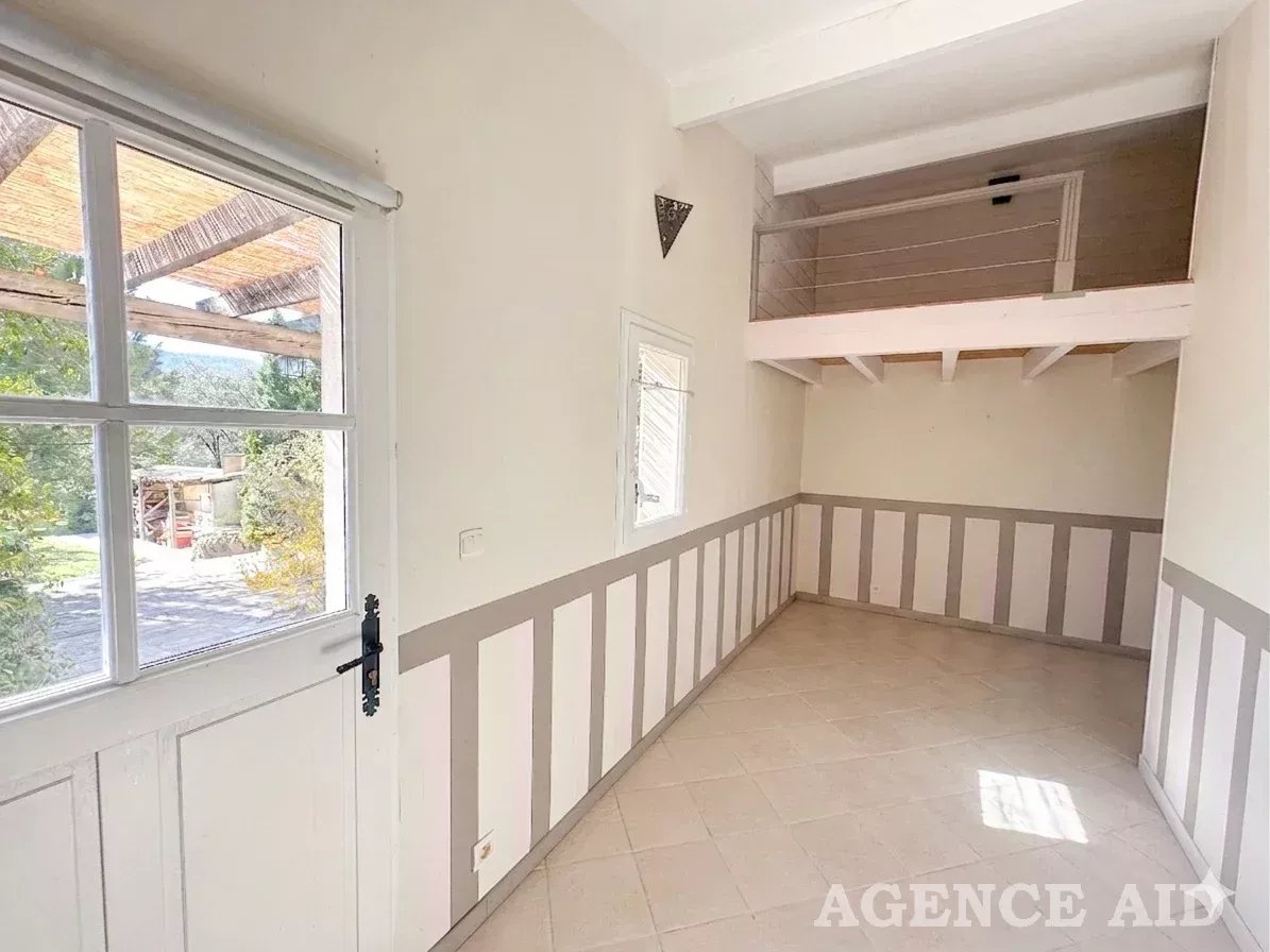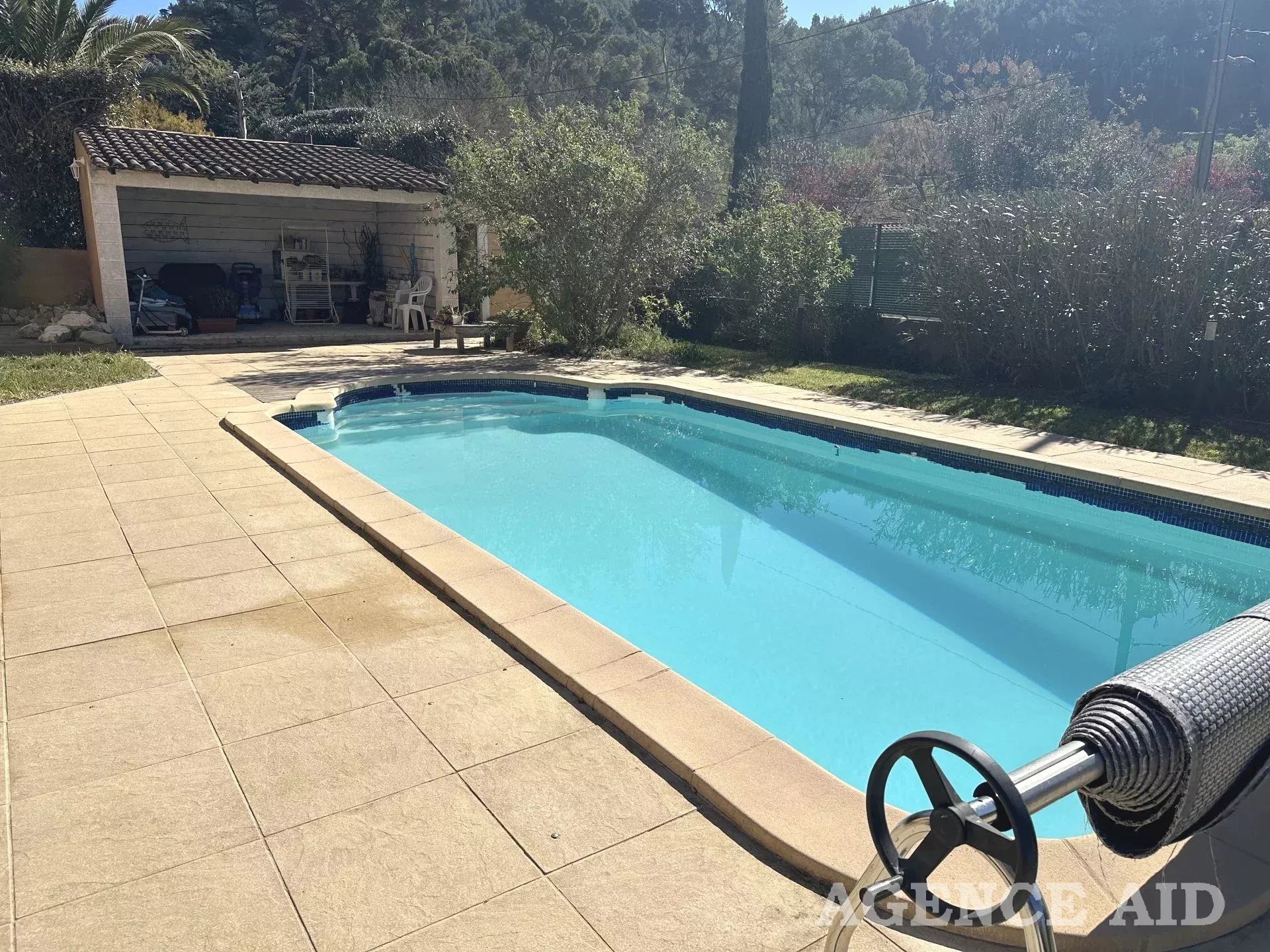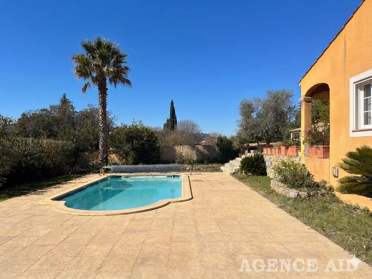 Grande terrasse carrelée en partie couverte. 1083m2 environ de terrain clos, arboré et paysagé de diverses essences méditerranéennes, piscine , plage dallée, abris, coin barbecue, petite dépendance aménagée en une pièce pouvant être transformée en bureau ou atelier. Petite terrasse attenante ombragée. Garage attenant avec mezzanine ouverture et portail automatiques, visiophone, vue imprenable ensoleillement optimum. Coup de cœur assuré à découvrir sans tarder Mdt 96249